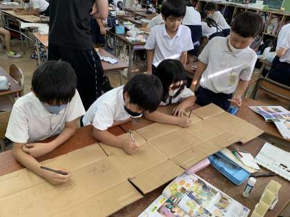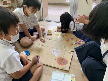 「ペタパタひらくと」では、係活動で協力して段ボールを開いたところにテーマを決めて作品を仕上げています。見ていると声を掛け合ったり一緒に絵の具を塗ったりを力を合わせている係がたくさんありました。