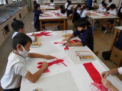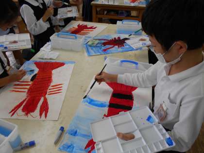 今日の図工の時間は、前に描いたザリガニの仕上げと後ろの水を絵の具で描きました。久しぶりの絵の具でしたが、手際よく準備をして塗りました。大きい筆に絵の具いっぱいつけて塗ることが初めてだったので、戸惑っていましたが、慣れてくると上手にできて完成させました。