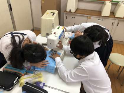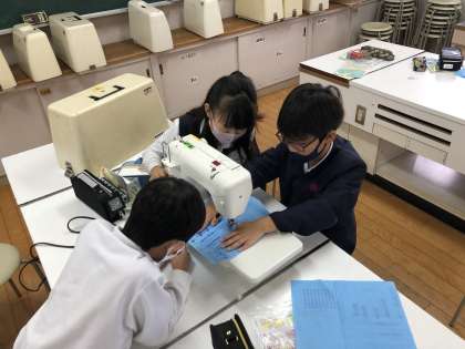 家庭科の時間では、初めてミシンを使う学習をしました。エプロン作りに向けて、ミシンに慣れるために、糸を使わずにからぬいをしました。手順をしっかり確認してから、スムーズに行うことができました。