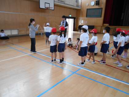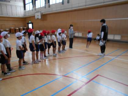 雨だったので、体育館で大繩で8の字跳びをしました。始めは縄の中に入るタイミングがつかめず、止まっている子がいたり、入っても跳べない子もいましたが、何度も練習しているうちにコツをつかんできた子がいました。また来週も体育の時間に練習しようと思います。みんなが少しずつ上手に跳べるようになるといいですね。