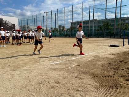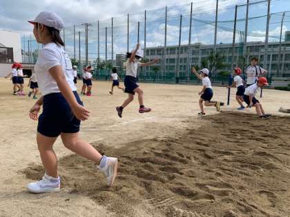 体育では走り幅跳びを行っています。まだ走り幅跳びの授業は2回目なので、片足で踏み切って両足で着地する練習や、上に跳ぶ練習をしました。