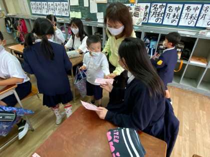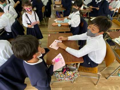 1年生が6年生へ、全校オリエンテーリングのお礼の手紙を渡しに来てくれました。