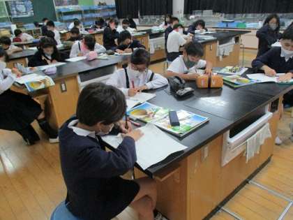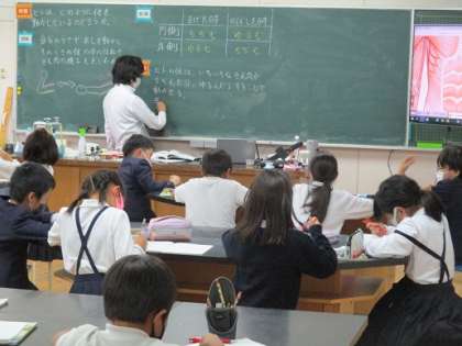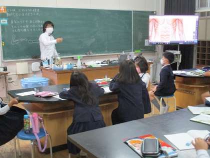 「ヒトの体のつくりと運動」について学習しています。今日は、腕や足を曲げたり伸ばしたりした時に、どこの筋肉が伸びたり縮んだりするのかを考えました。自分の体を動かし触りながら、ノートにまとめていました。