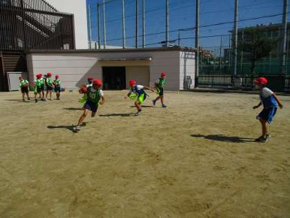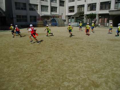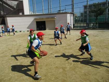 タグラグビーを始めて3週間目に突入しました。そろそろ実戦に近い練習になってきました。今回はいよいよ4対3です。人が増えた分、コートが狭く感じます。考えて動かないと、味方の邪魔をすることにもなるし、ボールをもらえません。チームでの作戦も必要になってきますね。失敗も多いけど、みんな考えて全力で何度も何度も挑戦しています。