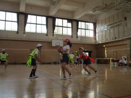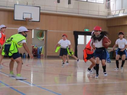 タグラグビーも実践練習です。試合のように、攻守を交代しながら練習しました。進めた分だけ、自分たちが有利になります。1歩でもボールを前に運ぼうと、グループで必死に動いていました。