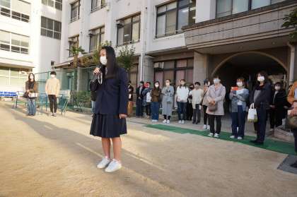 天候に恵まれ、気温も低すぎず、高すぎない過ごしやすい気候のなか、出発式は行われました。児童代表の言葉は山本さんが行い、最後はみんなで見送りの保護者の方々に「行ってきます!」と言ってバスにのりこみました。