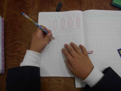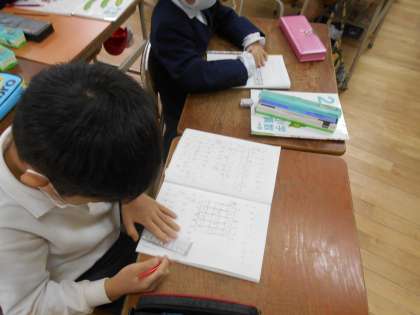かけ算の学習に入っています。1つ分が3こで5つ分ではいくつになるのか、を図で表して、たし算で答えを出しました。ブロックや図を使うことでかけ算に少しずつ慣れてきているようです。