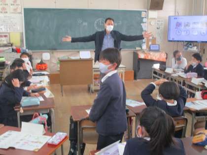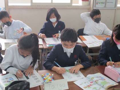 「What time is it?」の表現を使って、「何時に何をしているか」を尋ねたり答えたりする練習をしました。頭ではわかっているのですが、なかなか声に出して答えられない子が多かったです。復習が大事ですね!!