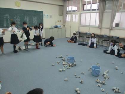「飛行機とばし」「新聞玉入れ」「頭乗せリレー」「大玉転がし」です。先生が考えた、くだらない遊びを、みんな一生懸命に楽しんでくれていました。みんなやさしいね!!選手宣誓から結果発表まで、あっという間の1時間でした。