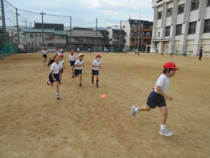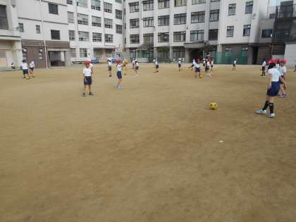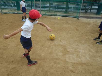 今日の体育は、準備体操・縄跳びをしてから運動場を走りました。その後、前の時間にしたことを振り返りながら、2人でボールの蹴り合いをしました。まっすぐボール蹴ることをした後に、的あてゲームをしました。小さいコーンを置いて当てるゲームです。みんな狙って蹴りましたが、クラスで一人しか当たりませんでした。