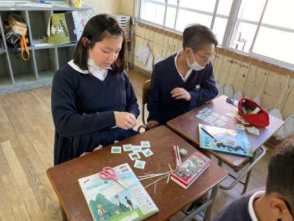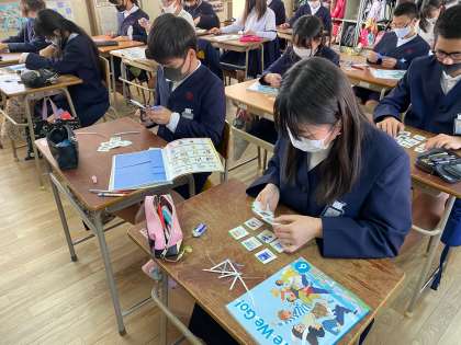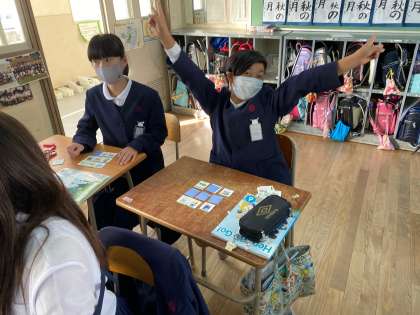 今日の外国語は、「町を紹介しよう」で、町にある建物の単語を学習しました。