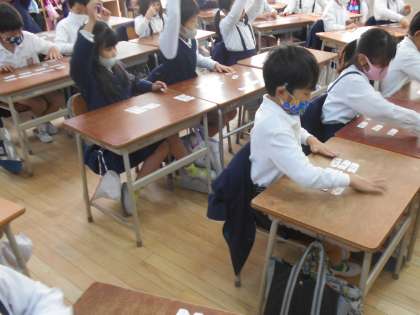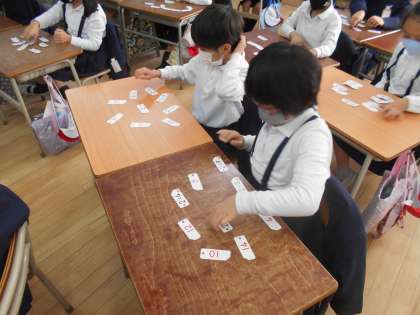 九九の学習になり、2の段を進めています。九九カードを使って、式や答えを見つけることをしました。少しずつ覚えてきているので、カードを早く取れるようになってきました。
