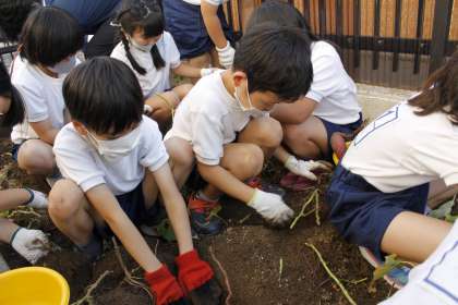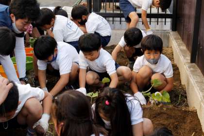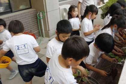 5時間目に学習園の。いもほりをしました。一人ひとり割り当てた場所を掘っていもを掘りました。いろいろな大きさがありましたが、楽しそうに掘り、取れたいもを洗って教室前に干しました。子どもたちは、次に食べる話をしていました。どのようにして食べるのか楽しみにしてください。