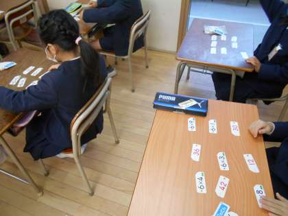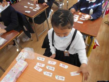 九九は6の段まで学習しました。九九カードを使って、見て言って覚える活動をしています。バラバラに置いてカードを取ることもしました。家でも6の段まですらすら言えるように練習しましょうね。