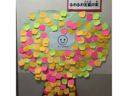 今月は「ずっと笑顔で」を意識したふわふわ言葉の実を書いてもらいました。今月は3年生が撮っても頑張って書いてくれていました。内容を見ると「ありがとうって言ってもらえると笑顔になるよ」「笑顔になると気持ちがいい」といった内容が多くみられました。