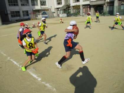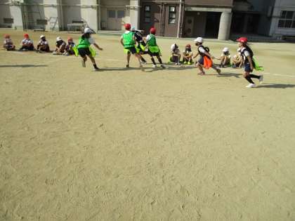 今回で最後なので、みんなが見ている前で2チームずつ行いました。今日は教頭先生にゲストに来てもらい、上手な子を発表してもらいました。みんな見に来てくれることを楽しみにしていて、いつも以上に気持ちが入ったプレーでした!!終わることはさみしいですが、みんなが走り回っている様子を見ていると、取り組んでよかったなと思います。