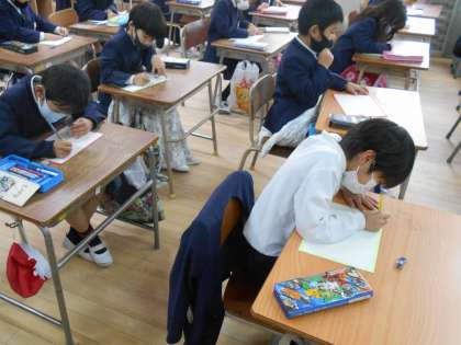 クリスマスカードを作りました。赤色か緑色か決めて、メッセージを書きました。その後、絵を描いたり色を塗ったりして完成しました。ツリーやサンタなど思った絵を描き楽しく活動しました。持って帰っているので楽しみにしてください。。