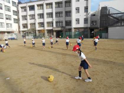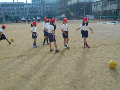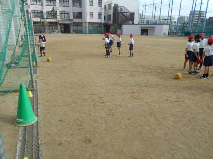 1時間目の体育はボールをリフティング練習した後、ゴールを使って的あてゲームをしました。ゴールの中に小コーンと大コーンを置き、小コーンは5点、大コーンは3点、コーンに当たらずゴールすると1点、入らないと0点という得点を決めてしました。4列に分かれて、8人蹴って得点を競いました。3回戦して楽しくできました。