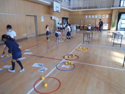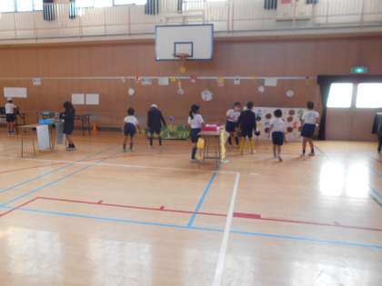 体育の後、講堂で子どもまつりをしました。昨日は自分のクラスのお店で遊びましたが、今日は全学年のお店がそろっていたのでいろいろ回って友だちといっしょに遊びました。射的や的あて、ボーリングなどできて、子どもたちにはうれしいクリスマスプレゼントになったのではないでしょうか。