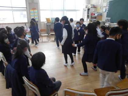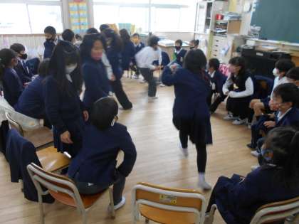 昼休みはあそび係さんが決めたフルーツバスケットをしました。おにが言ったフルーツが好きな人が動きました。バナナや桃などいろいろなフルーツを言って席を変わっていき、楽しみました。