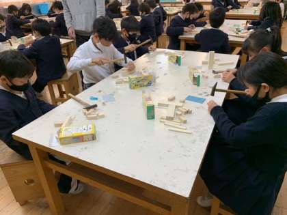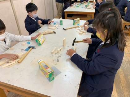 金づちの使い方を知ったり、どんな作品にするかを考えたり、楽しみながら作ることができていました。