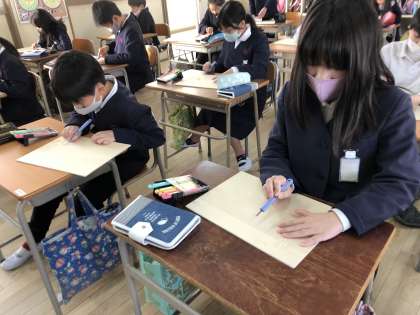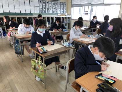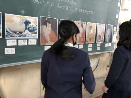 作品展に向けて「浮世絵」の木版画の制作に取り掛かりました。まず始めに、どの絵にするのか、いくつかある「浮世絵」に中から、自分が挑戦したいと思う絵を選びました。次に、彫刻刀の名前思い出したり、使い方の練習をしました。彫った後の線が、彫刻刀の種類によって違うことを再確認することができました。