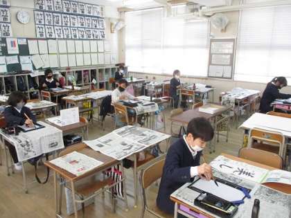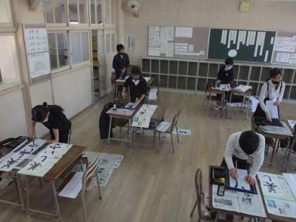 書初めで「美しい空」を書きました。いつもの書写よりスペースがたくさんいるので、4つの部屋に分かれて行いました。場所には余裕があったのですが、4文字書くので時間にはあまり余裕がありませんでした。でも、頑張って書いていたと思います。また、掲示したらホームページに載せますね。