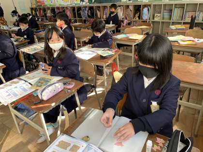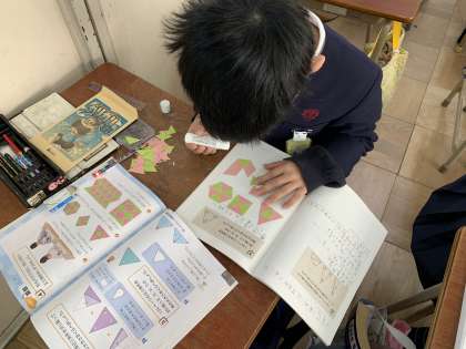 「三角形と角」の学習では、同じ二等辺三角形と正三角形の形を敷き詰め、模様を考えました。簡単な作業でしたが敷き詰めていく難しさとできる模様の楽しさを味わいました。