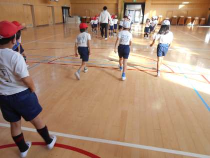 大なわ跳びをするとき、跳び終わったら早く出れるように最初に片足で跳ぶ練習をしました。跳び方はわかってきたので大なわでの挑戦です。前の時間より回数は多く跳べるようになってきています。片足で跳んですぐ出れるようになった子もいました。