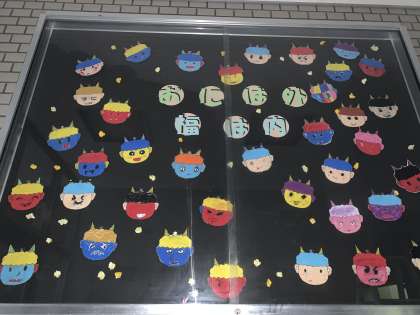 2月の玄関掲示は3年生です。2月には節分がありますので鬼をみんなで作りました。一人ひとり思い思いの鬼を作りました。かわいい鬼もいれば怖い鬼もいます。学校に来られた時にはぜひ見てあげてください。