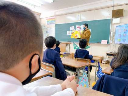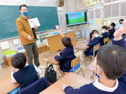 普段は,3〜6年生に授業をしてくださっている先生と,1年生も外国語の授業を行いました。はじめは,少し戸惑っていましたが,雰囲気に慣れてくると,みんな楽しそうに活動していました。