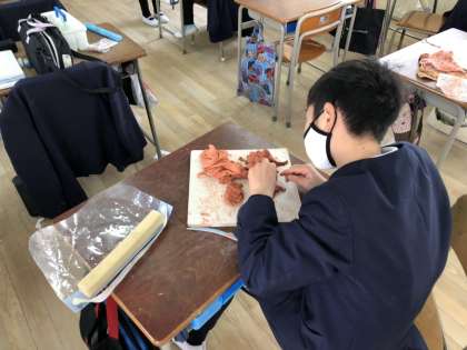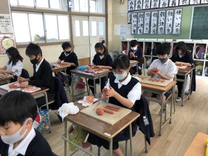 今日は1時間目から、作品展に出品するシーサーを「はにわ粘土」で作りました。まず始めに、胴体や脚から作り、次に、頭や顔を作りました。頭や顔は、本物のシーサーの映像を参考に自分なりに工夫しました。個性豊かな面白いシーサーが出来上がりました。作品展をお楽しみに。