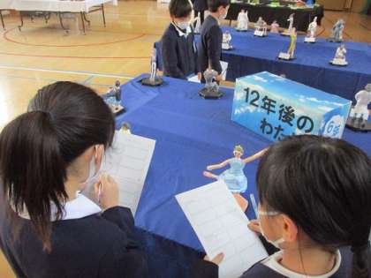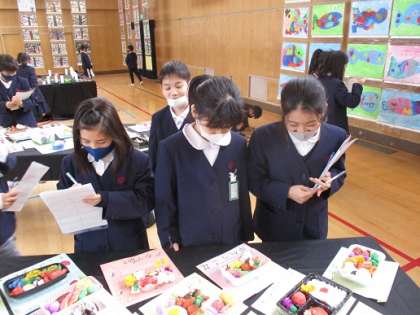 作品展の鑑賞に行きました。たくさん作品が並んでいるので、時間が来ても「まだまだ見たい」という声が多かったです。上手な作品を探すというより、たてわり班や地域子ども会などで知っている子の作品を探し、感想を書いている子が多かったです。どの学年の作品にも興味津々でした。