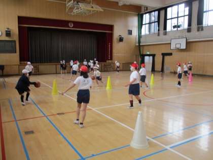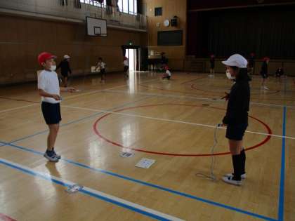 なわとびの練習をがんばっています。「前跳び」「後ろ跳び」「あや跳び」「交差跳び」「二重跳び」の目標を決めて、記録に挑戦しています。毎回15分間ぐらいしかないですが、少しずつ目標を達成する子が増えてきました。目標がはっきりしていると、目の輝きがちがい、がんばる姿勢が増えました!!達成した時に報告しに来る顔は、本当に充実しています。もう全部達成した子もいます!!ほかの子も、負けないように頑張ってください。後半はポートボールの練習をしています。ドリブルしながら、おにっごっこをしました!!