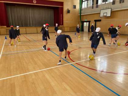 体育のサッカーでは、シュート練習やパス練習をしています。楽しくたくさんボールを蹴っています!