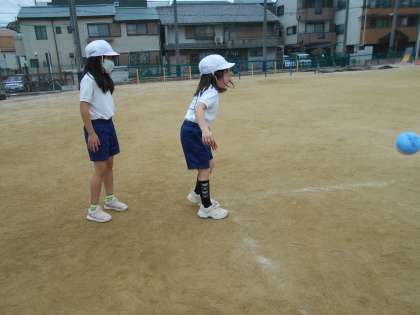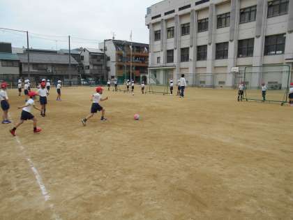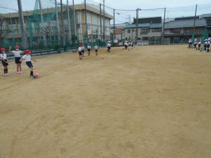 ボール蹴りで、的あてをしました。ネットをめがけて蹴って当てました。次にコーンを置いて、ねらう子はねらって蹴りました。得点方式にしてチームで何点取ったかを競うこともしました。