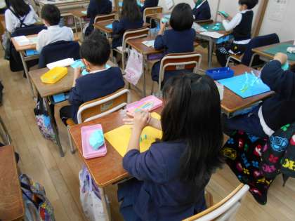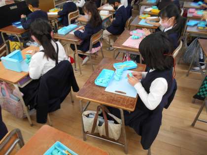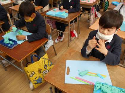 粘土で動物を作りました。まず体や足を作り、最後に頭や顔を作りました。早くできた子は、ちがう動物も作りました。友だちの作った作品を参考にして、工夫した動物を作りました。