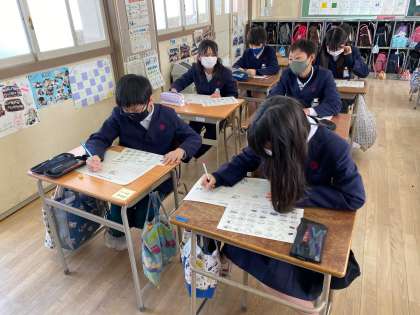 バランスの良い食事をとるためにはどうすればよいのかについて考えました。給食では、「緑・赤・黄」のバランスを考えて作られています。中学校へ行っても、好き嫌いせず残さず食べてほしいです!!