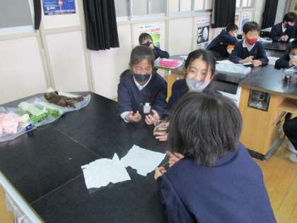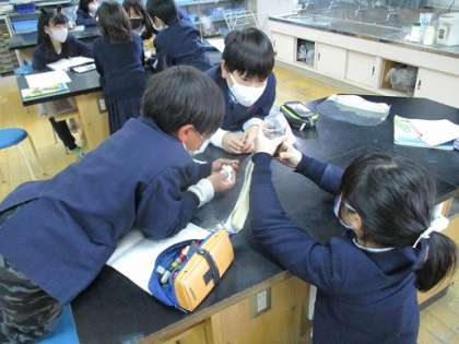 金曜日に置いて帰った実験の結果を観察し、まとめました。次回の実験は「目に見えない空気中の水蒸気をどのように捕まえるか」だそうです。みんなの顔には?がたくさん並んでいました。難しいですね。でも実験は大好きなのでがんばりましょう。