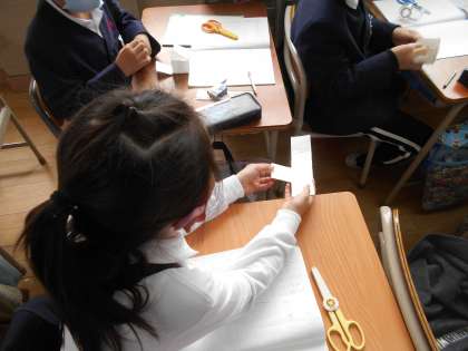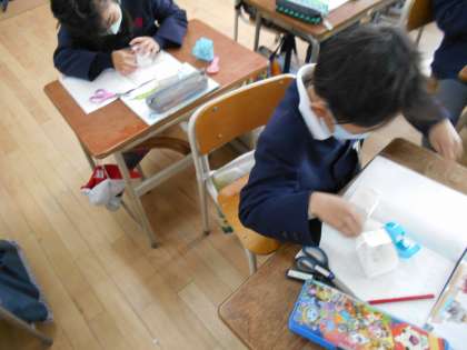箱について学習しています。箱を切り開いたものを組み立てています。長方形や正方形の辺をくっつけて作りました。長方形だけの箱を作るのが難しかったようです。