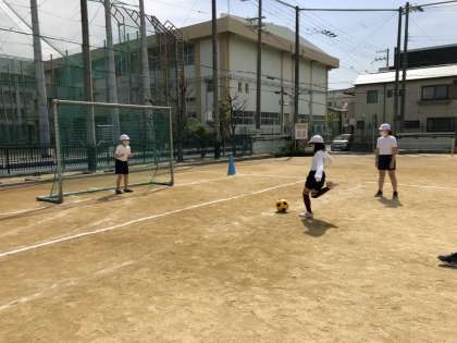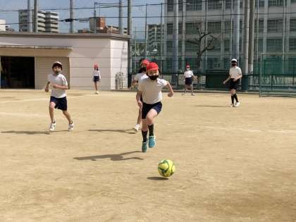 体育の学習では、サッカーの試合をしています。みんながボールを蹴って活躍できるように、一つのチームの人数を5〜6人と少なくしています。特別なルールも各クラスで工夫しています。試合を始める前には、それぞれのチームでパスやシュートの練習を頑張っています。サッカーを習っている人は、チームメイトにアドバイスをしてチーム力をアップさせています。