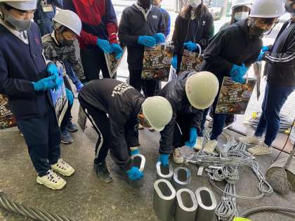 社会見学で中村工業へ行きました。ワイヤロープを作っている過程を見学し、大変さや難しさなどを学ぶことができました。
