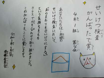 清潔検査は、一年間で4位になりました。1位から3位までは5・6年生でした。もっと上を目指したかったけど、仕方ないですね。さすがです!!来年はもっと上で表彰されるといいね!!