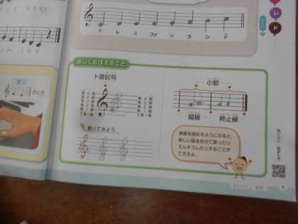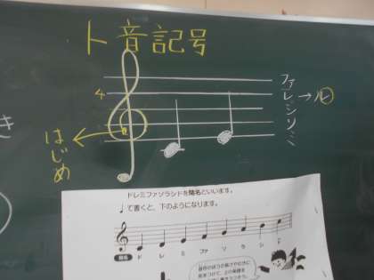 音楽の時間の後半に、音符を書く練習をしました。階名を確認し、書き順に気を付けて丁寧に書いていました。またト音記号も勉強しました。お手本を見て何回も書きましたが、とても難しそうでした。特に曲線のところは難しかったようです。