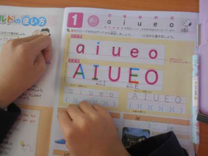 今日からローマ字の勉強を始めました。今日は「a i u e o」と「A I U E O」を勉強しました。書き順を確認し、小文字と大文字を書いていきました。一回だけでは、覚えられないので何回も書いて覚えていきましょう!