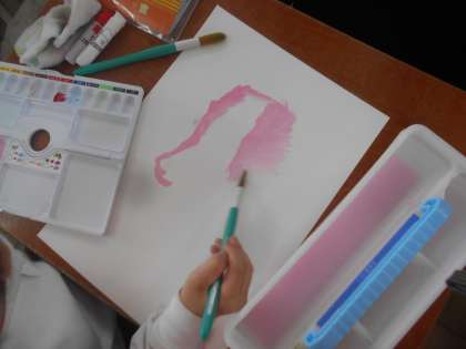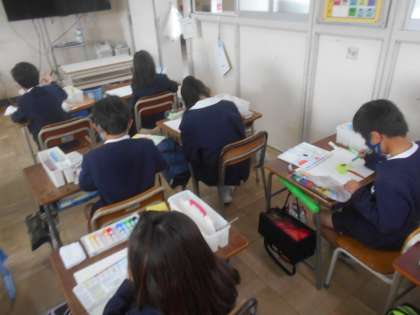 3年生になって初めて絵の具を使いました。今日は絵の具の使い方を復習し、決められた時間内に作品を完成させることを目標に取り組みました。