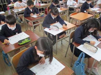 1カ月間のまとめを行いました。復習をした後、プリントで確認しました。主に聞き取る練習です。どんなものかドキドキしていたみたいですが、子どもたちはしっかりと自信をもって取り組めていました。5月はどんな学習をするのでしょうか。楽しみですね。
