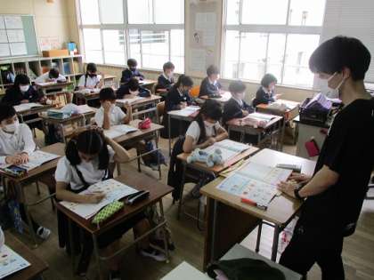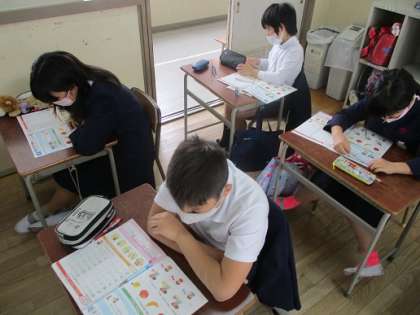5年生では外国語活動のドリルを使って、聞き取り・書き取りの練習をしています。前回の復習プリントの出来が良かったみたいで、みんな自信を持って取り組めています。できるという自信が次の学習の意欲につながっていると思います。どんどん外国語が得意になってほしいです。