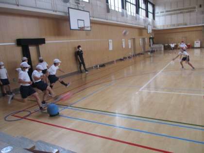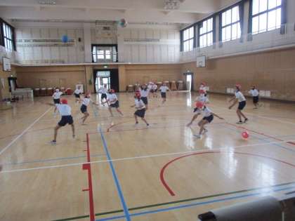 前回の学級遊びの「キックベース」が盛り上がったので、2回目を行いました。今回はなんとボールが3つです!!グループで協力しないとうまくいかないので、自然と声かけをし、作戦を練っていました。