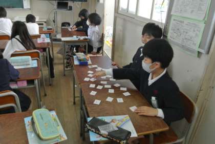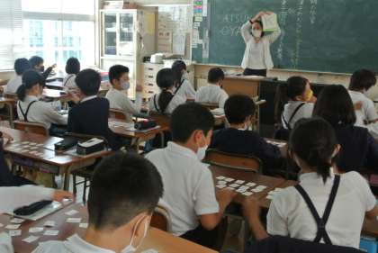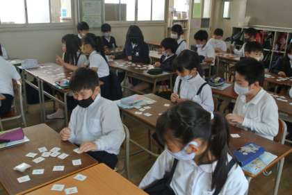 まず、先生が、子どもたちに見えないようにアルファベットを1つ選んでおきます。次に、子どもたちはアルファべットを読みながら、ペアで1枚ずつ引いていきます。全部ひき終わったら、最後に先生が選んだアルファベットを発表し、そのアルファベットカードを持っていた人がラッキー!勝ちです!!